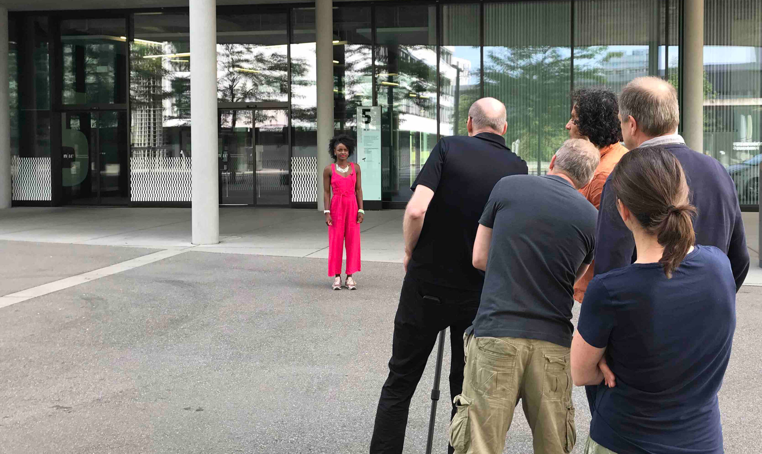 Passende Orte für eine Interviewsituation (wie wir sie vermutlich am häufigsten anwenden werden) konnten wir schnell auf dem Campus Brugg-Windisch finden. Der Eingangsbereich, die Gänge mit den grossen Kunstinstallationen oder schon die Architektur der Gebäude lieferten eine imposante Kulisse. Alle Kursteilnehmenden bedienten die Kameras und es kam eine Fülle an Videomaterial zusammen. Zu unserem Glück waren die Wetterbedingungen perfekt: trocken und kein direktes Sonnenlicht. Daher konnten wir mit einer Drohne imposante Überflugaufnahmen über den Campus, welche wir nun unterschiedlich einsetzen können, erstellen. Das Ziel war, möglichst viel, sehr gutes Videomaterial zu sammeln. Dabei sollte auch unbedingt ein Zug über das Gleisfeld fahren, entsprechend gross war unsere Freude, als dieser nach einigen Versuchen auf dem Vorschaubildschirm auftauchte! Eine «Schauspielerin» aus unseren Reihen war schnell gefunden: Leticia Venancio, sie bringt viel Theatererfahrung mit, stellt im Interview das Modul vor, in welchem Sie als Dozentin tätig ist. Das fertige Video sollen die Modulverantwortlichen später nutzen können. Ein direkter Praxiseinsatz eines erstellten Films konnte erfolgreich umgesetzt werden.