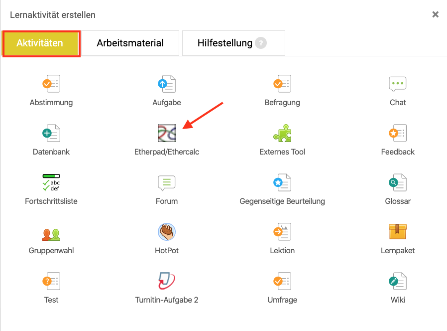 Ab sofort steht in allen Moodle-Kursen die Aktivität “EtherPad/EtherCalc” zur Verfügung.