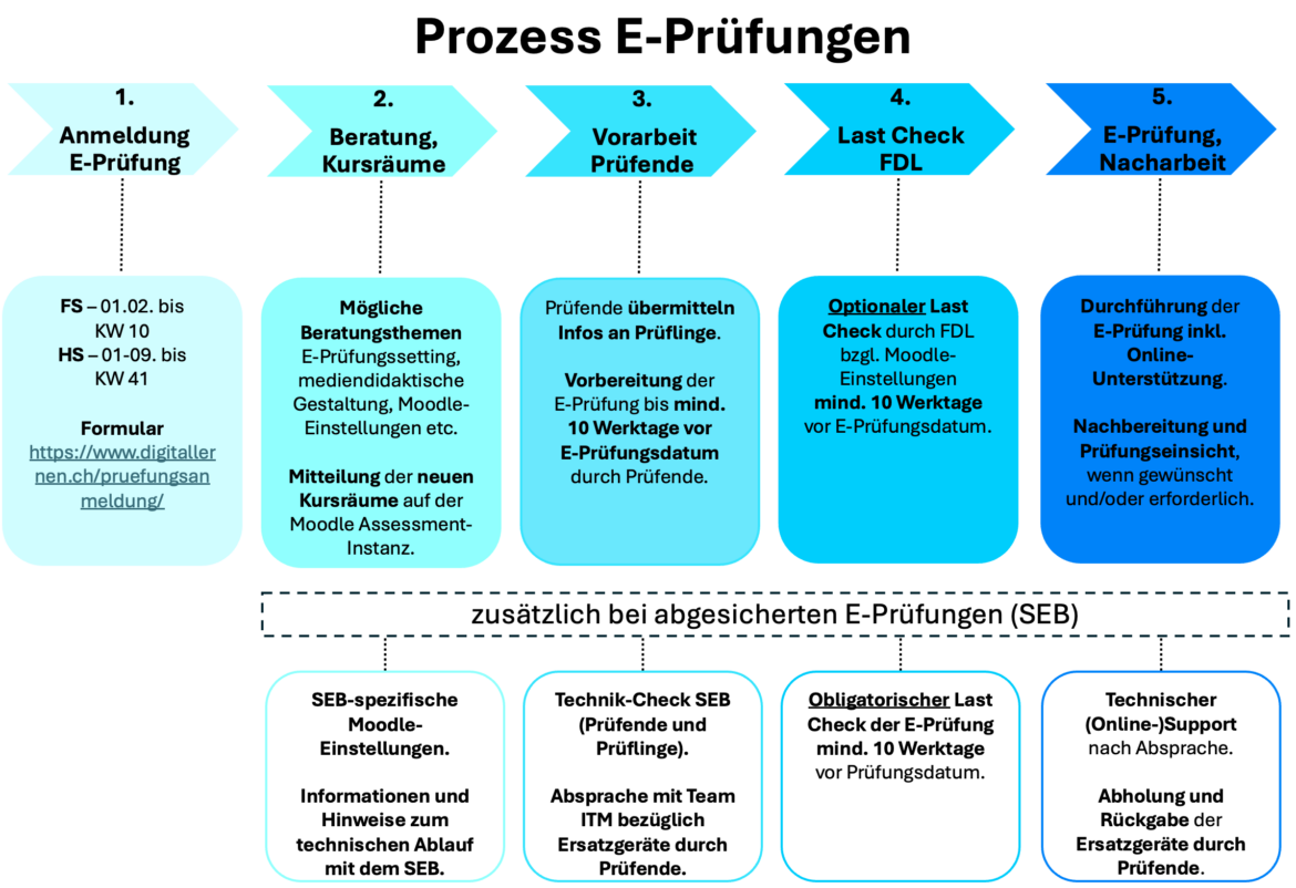 Zum bekannten, regulären Prozess E-Prüfungen, kommen verschiedene zusätzliche Schritte hinzu, wenn die E-Prüfung mit dem SEB abgesichert wird.
