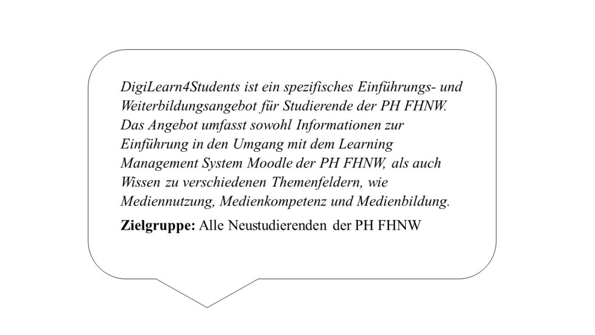 «DigiLearn4Students@PH FHNW» (DL4S) ist ein Angebot der Fachstelle Digitales Lehren und Lernen (FDL) für Neustudierende der PH FHNW. Thematisiert werden ausgewählte Future Skills, die mit Blick auf die «Digitalen Studierendenkompetenzen» grundlegend für ein erfolgreiches Studium sind. Ergänzend dazu werden aber auch praktische Tipps, verwandte Themenbereiche wie die Tools der FHNW oder das Learning Management System (LMS) Moodle und KI im Studium adressiert.