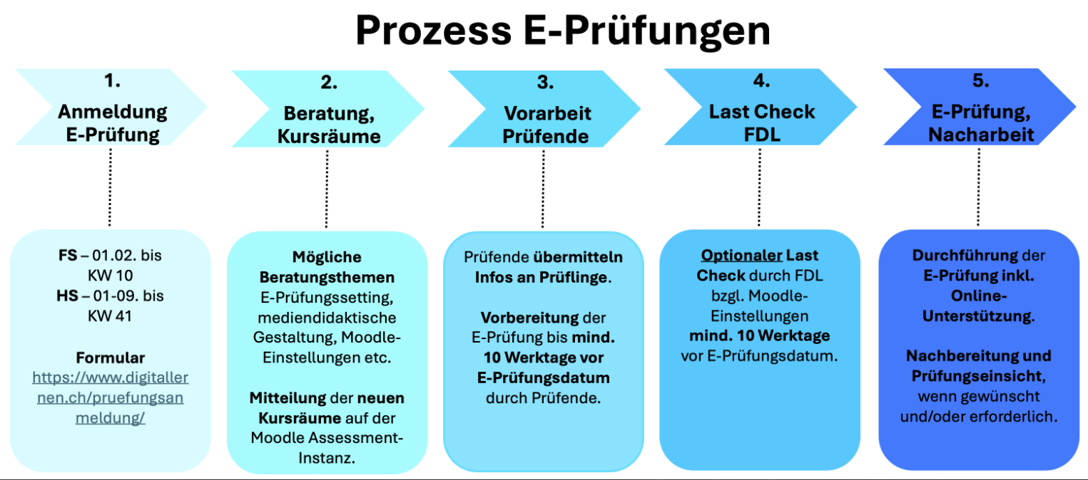 - Nach Absprache «letzter Check» der E- Prüfungseinstellungen im Moodle Assessment-Kursraum