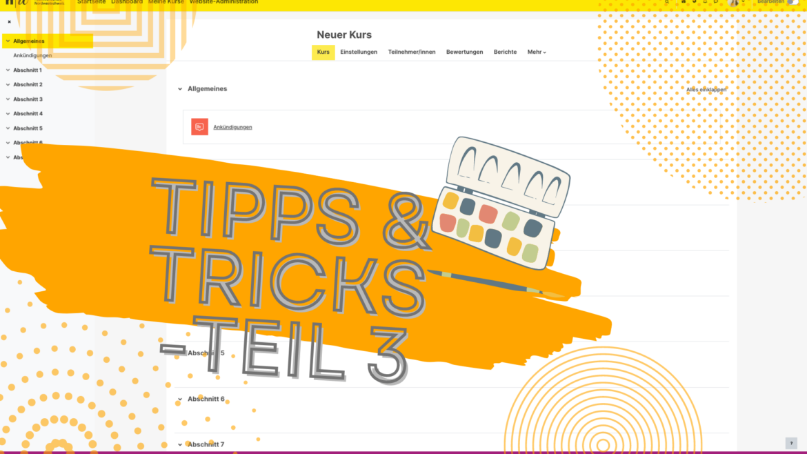 Dieser Selbstlernkurs mit Beispielen zeigt Ihnen exemplarisch auf, wie Sie einen Moodle-Kursraum didaktisch sinnvoll aufbauen und ansprechend gestalten können. Gleichzeitig werden ausgewählte Aktivitäten und Arbeitsmaterialien kurz und prägnant erläutert.